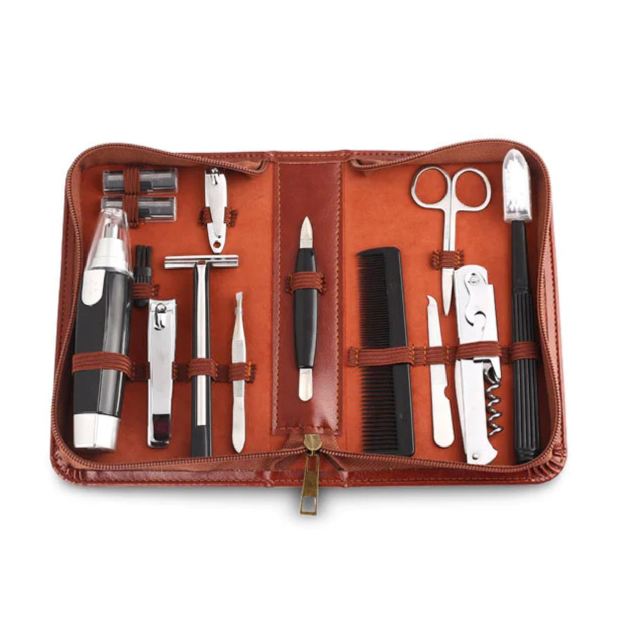 This Men's Republic 12 Piece Grooming Kit is a remarkable gift for the dapper man who enjoys staying well-groomed. The Ultimate 12 Piece Grooming Kit that includes all the essentials for an ideal groomed look, at home or on the go. An ideal kit for the travelling businessman. It is lightweight for convenience and easy storage. The kit includes a stylish faux leather zip case.